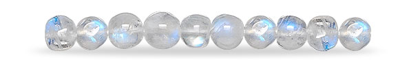 Moonstone has translucent white color with a white sheen similar to “moonshine” that rolls or flows over the stone when rotated, hence the name “moonstone.” The sheen is caused by light diffraction within layers of feldspar. Generally a creamy translucent white stone, rainbow moonstone features occasional iridescent or multicolored (especially blue) flashes with transparency that ranges from opaque to semitranslucent. Rainbow moonstone is best seen in natural light for play of color. Moonstone has been used in jewelry going back to ancient civilizations. The Romans believed moonstone was born from solidified rays of the moon. The Greeks and the Romans associated moonstone with their lunar gods. During the Art Nouveau period in the early 20th century, moonstone became popular with artists and goldsmiths for creating jewelry.